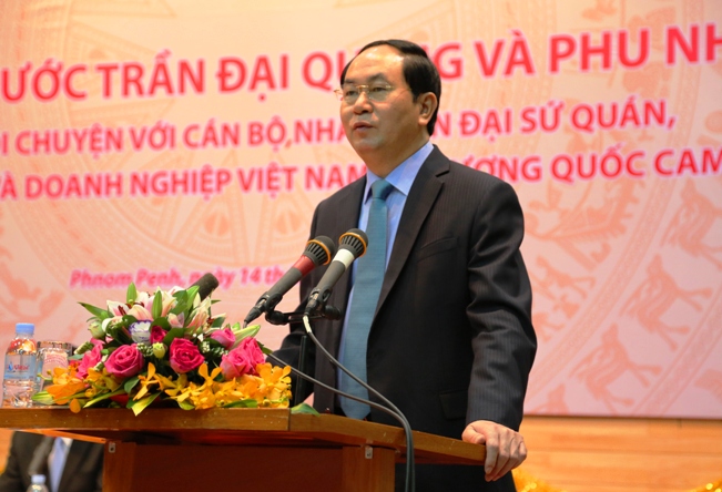 Phát biểu tại buổi gặp mặt, Chủ tịch nước Trần Đại Quang gửi lời chúc mừng tốt đẹp, tình cảm thân thiết đến các cán bộ, nhân viên Đại sứ quán, các cơ quan đại diện Việt Nam tại Campuchia, bà con Việt kiều, doanh nghiệp, doanh nhân, lưu học sinh Việt Nam tại Campuchia. Chủ tịch nước thông báo một số nét chính về tình hình kinh tế, xã hội của đất nước, những thuận lợi, khó khăn đan xen trong bối cảnh khu vực và thế giới có nhiều biến chuyển.