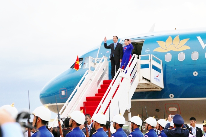 Chiều 14/6, Chủ tịch nước Trần Đại Quang và Phu nhân, cùng đoàn đại biểu cấp cao Việt Nam đã tới thủ đô Phnom Penh, bắt đầu chuyến thăm cấp Nhà nước tới Vương quốc Campuchia theo lời mời của Quốc vương Campuchia Preah Bat Samdech Preah Boromneath Norodom Sihamoni.