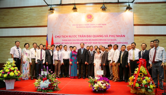 Chiều cùng ngày, Chủ tịch nước Trần Đại Quang, Phu nhân, cùng đoàn đại biểu cấp cao Việt Nam đã đến thăm và nói chuyện với cán bộ, nhân viên Đại sứ quán, các cơ quan đại diện Việt Nam tại Campuchia, bà con Việt kiều, doanh nghiệp, doanh nhân, lưu học sinh Việt Nam tại Campuchia.