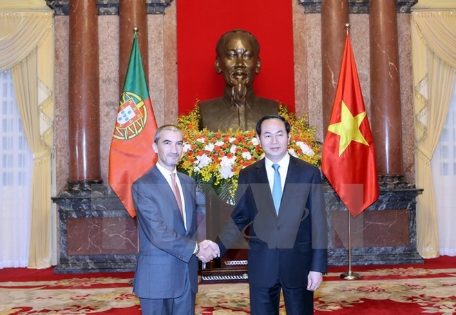 Chủ tịch nước Trần Đại Quang tiếp Đại sứ Bồ Đào Nha Francisco Assis Morais E Cunha Vaz Patto. (Ảnh: Nhan Sáng/TTXVN)