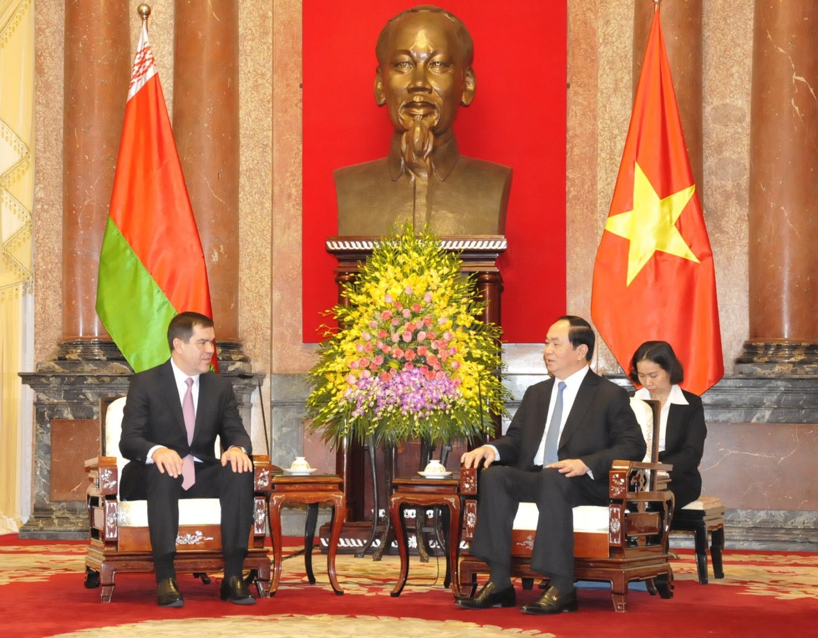 Chủ tịch nước Trần Đại Quang đánh giá cao kết quả hội đàm giữa Chủ tịch Vakulchik Valery Pavlovich với Bộ trưởng Bộ Công an Việt Nam Tô Lâm; vui mừng trước việc hai Bên đã trao đổi và thống nhất được các biện pháp hết sức cụ thể, thiết thực nhằm thúc đẩy hơn nữa quan hệ hợp tác giữa hai nước trên lĩnh vực thực thi pháp luật, bảo đảm an ninh quốc gia đi vào chiều sâu, có hiệu quả, vì lợi ích của nhân dân hai nước Việt Nam và Belarus.