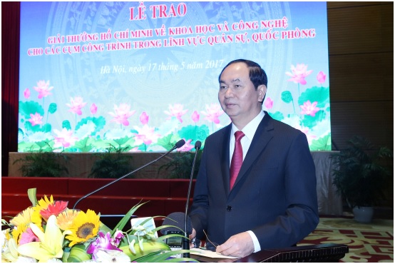Chủ tịch nước Trần Đại Quang nhiệt liệt biểu dương những thành tựu to lớn mà đội ngũ cán bộ khoa học và công nghệ quân sự Việt Nam đã đạt được trong những năm qua; chúc mừng các nhà khoa học, các tổ chức khoa học và công nghệ trong Quân đội có công trình được tặng giải thưởng cao quý - Giải thưởng Hồ Chí Minh về khoa học và công nghệ; nhấn mạnh hai cụm công trình trong lĩnh vực quân sự, quốc phòng của 52 đồng tác giả được trao Giải thưởng Hồ Chí Minh lần này có giá trị đặc biệt to lớn, là kết quả của sự dày công nghiên cứu, cống hiến trí tuệ và tài năng của các nhà khoa học quân sự.