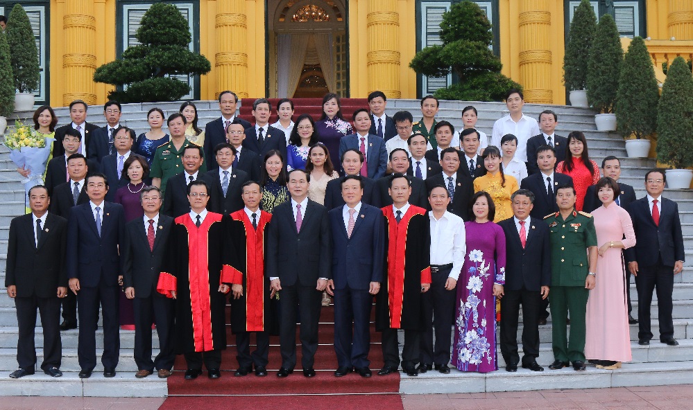 Chủ tịch nước Trần Đại Quang chụp ảnh lưu niệm với các đại biểu dự buổi Lễ trao Quyết định bổ nhiệm Thẩm phán Tòa án nhân dân tối cao và Phó Chánh án Tòa án nhân dân tối cao. (Ảnh: VPCTN)