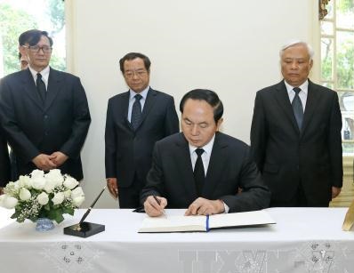 Chủ tịch nước Trần Đại Quang đặt vòng hoa viếng Nhà vua Thái Lan Bhumibol Adulyadej tại Đại sứ quán Thái Lan. Ảnh: Nhan Sáng/TTXVN