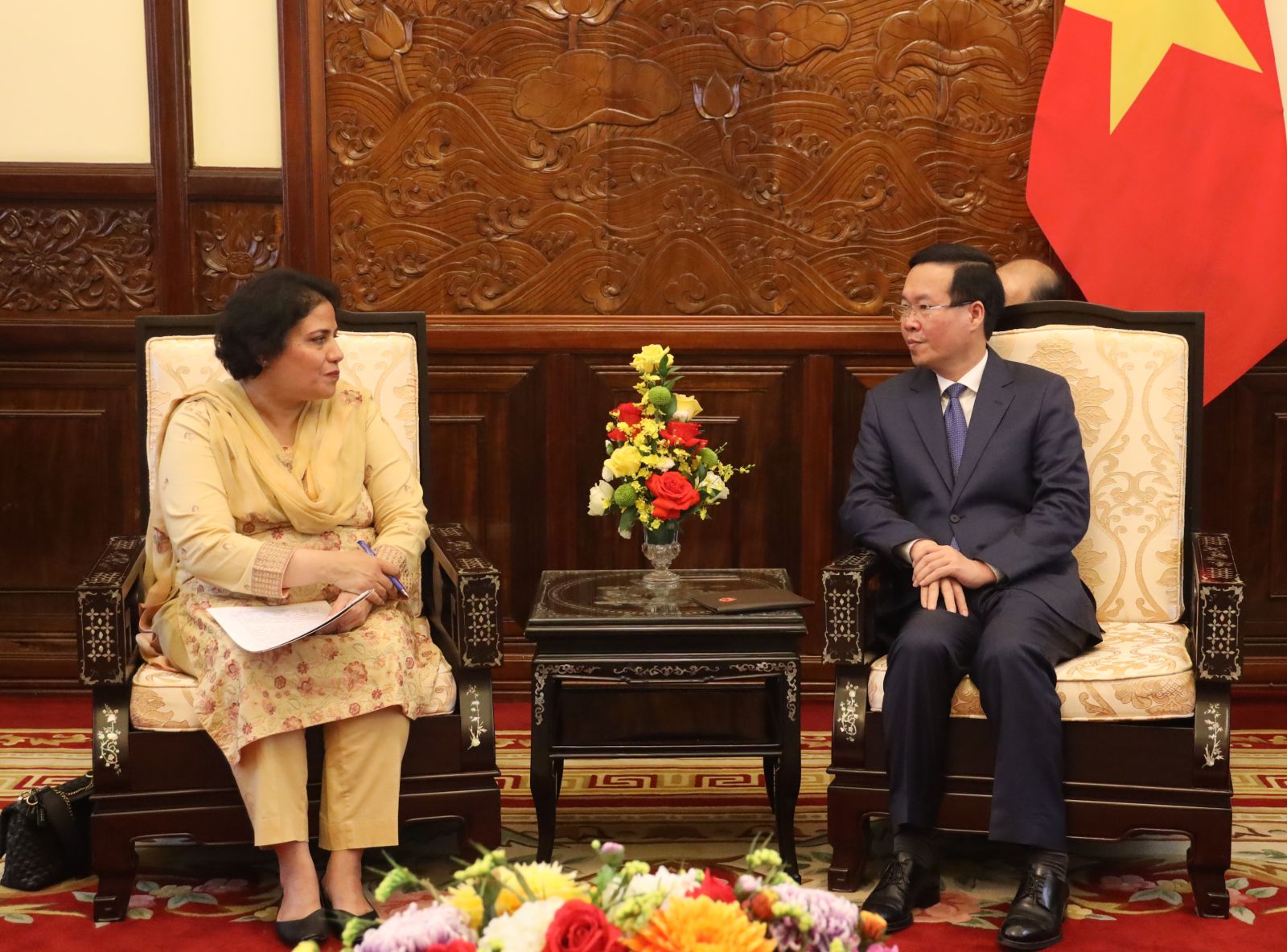 Chủ tịch nước Võ Văn Thưởng tiếp Đại sứ Cộng hoà Hồi giáo Pakistan Samina Mehtab. Ảnh: VPCTN