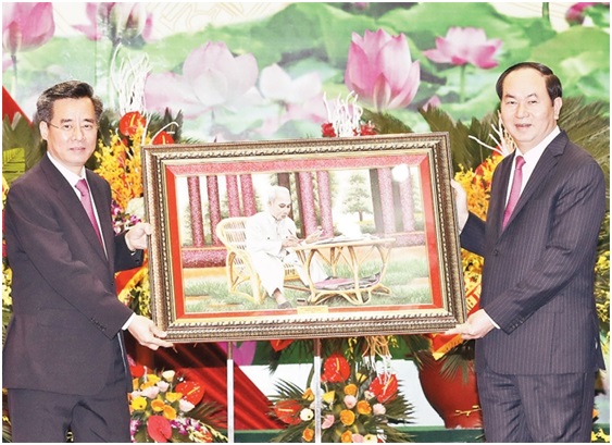 Chủ tịch nước Trần Đại Quang tặng bức tranh Chủ tịch Hồ Chí Minh cho Đảng bộ Khối các cơ quan T.Ư. (Ảnh: TTXVN)