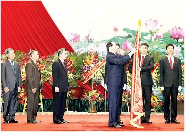 Chủ tịch nước Trần Đại Quang gắn Huân chương Lao động hạng nhất lên lá cờ truyền thống của Đảng bộ Khối các Cơ quan Trung ương