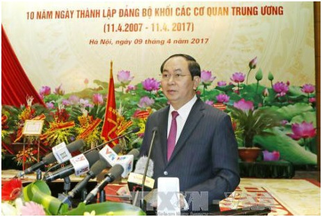 Chủ tịch nước Trần Đại Quang nhấn mạnh, Đảng bộ Khối các cơ quan Trung ương là đảng bộ các cơ quan tham mưu chiến lược của Trung ương Đảng, Chủ tịch nước, Quốc hội, Chính phủ, Mặt trận Tổ quốc Việt Nam và các đoàn thể chính trị-xã hội, do vậy vần thực hiện tốt các Nghị quyết của Trung ương, nhất là Nghị quyết Hội nghị lần thứ tư Ban Chấp hành Trung ương Đảng (Khóa XI, XII) về tăng cường xây dựng, chỉnh đốn Đảng gắn với thực hiện có hiệu quả Chỉ thị số 05-CT/TW của Bộ Chính trị (Khóa XII) về đẩy mạnh học tập và làm theo tư tưởng, đạo đức, phong cách Hồ Chí Minh có ý nghĩa quan trọng, có sức lan tỏa lớn đến các đảng bộ khác trong toàn quốc.