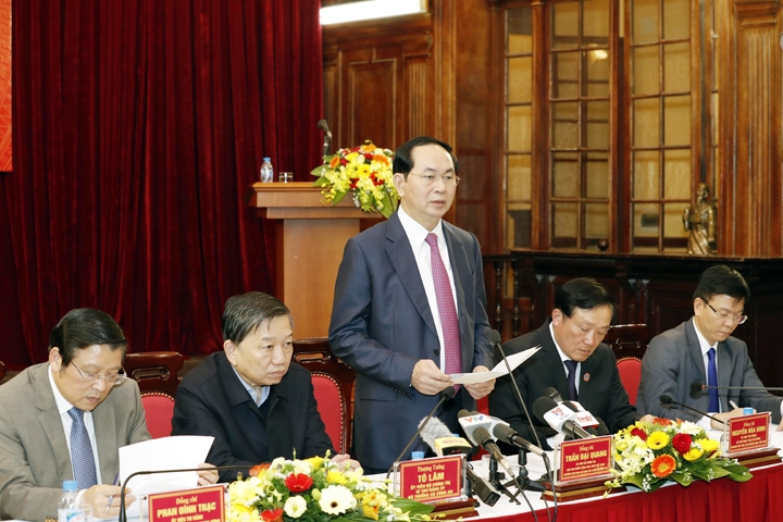 Bày tỏ đồng tình với phương hướng công tác phối hợp năm 2017, Chủ tịch nước Trần Đại Quang đặc biệt lưu ý các cơ quan có hoạt động tư pháp và nội chính Trung ương cần tập trung hoàn thiện chính sách, pháp luật, cơ chế phối hợp, đẩy mạnh đấu tranh, xử lý các loại tội phạm, nhất là các loại tội phạm hình sự, kinh tế trọng điểm, đặc biệt là tội phạm tham nhũng để góp phần giữ vững an ninh quốc gia, trật tự, an toàn xã hội, góp phần xây dựng, chỉnh đốn Đảng, xây dựng bộ máy Nhà nước trong sạch, vững mạnh. Mỗi cơ quan cần chủ động đề ra các kế hoạch, chương trình công tác của mình và làm tốt công tác phối hợp với các cơ quan hữu quan.