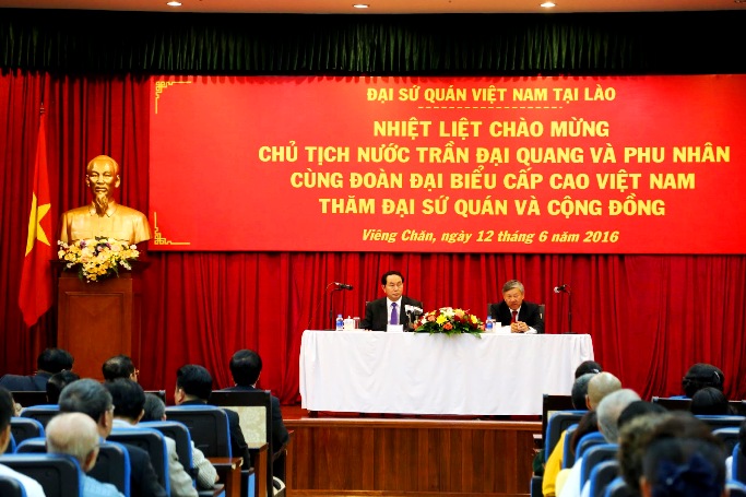 Đến thăm và nói chuyện cán bộ Đại sứ quán Việt Nam và cộng đồng người Việt Nam tại Lào, Chủ tịch nước Trần Đại Quang đánh giá cao tấm lòng sắt son yêu nước và những đóng góp tích cực của kiều bào ta cho quê hương đất nước. Chủ tịch nước Trần Đại Quang cũng thông báo cho bà con kiều bào về kết quả trao đổi với Lãnh đạo cấp cao Lào trong chuyến thăm lần này và một số nét nổi bật về tình hình kinh tế xã hội của Việt Nam.