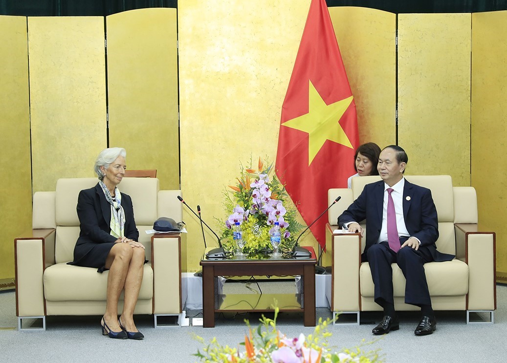Chủ tịch nước Trần Đại Quang và Tổng Giám đốc Quỹ tiền tệ quốc tế (IMF) Christine Lagarde. (Nguồn: TTXVN)