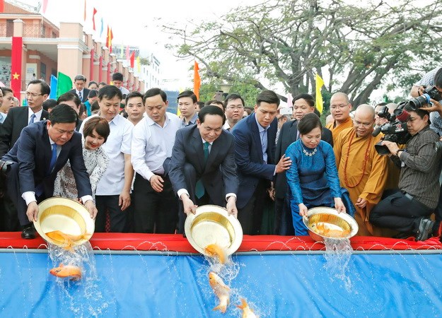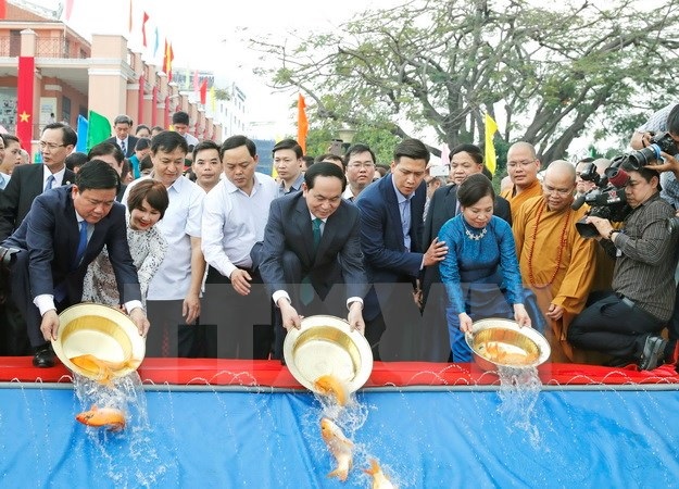 Chủ tịch nước Trần Đại Quang và Phu nhân cùng Bí thư Thành ủy TP. Hồ Chí Minh Đinh La Thăng và đông đảo bà con kiều bào thực hiện nghi lễ thả cá chép tại Bến cảng Nhà Rồng. (Ảnh: Nhan Sáng/TTXVN)