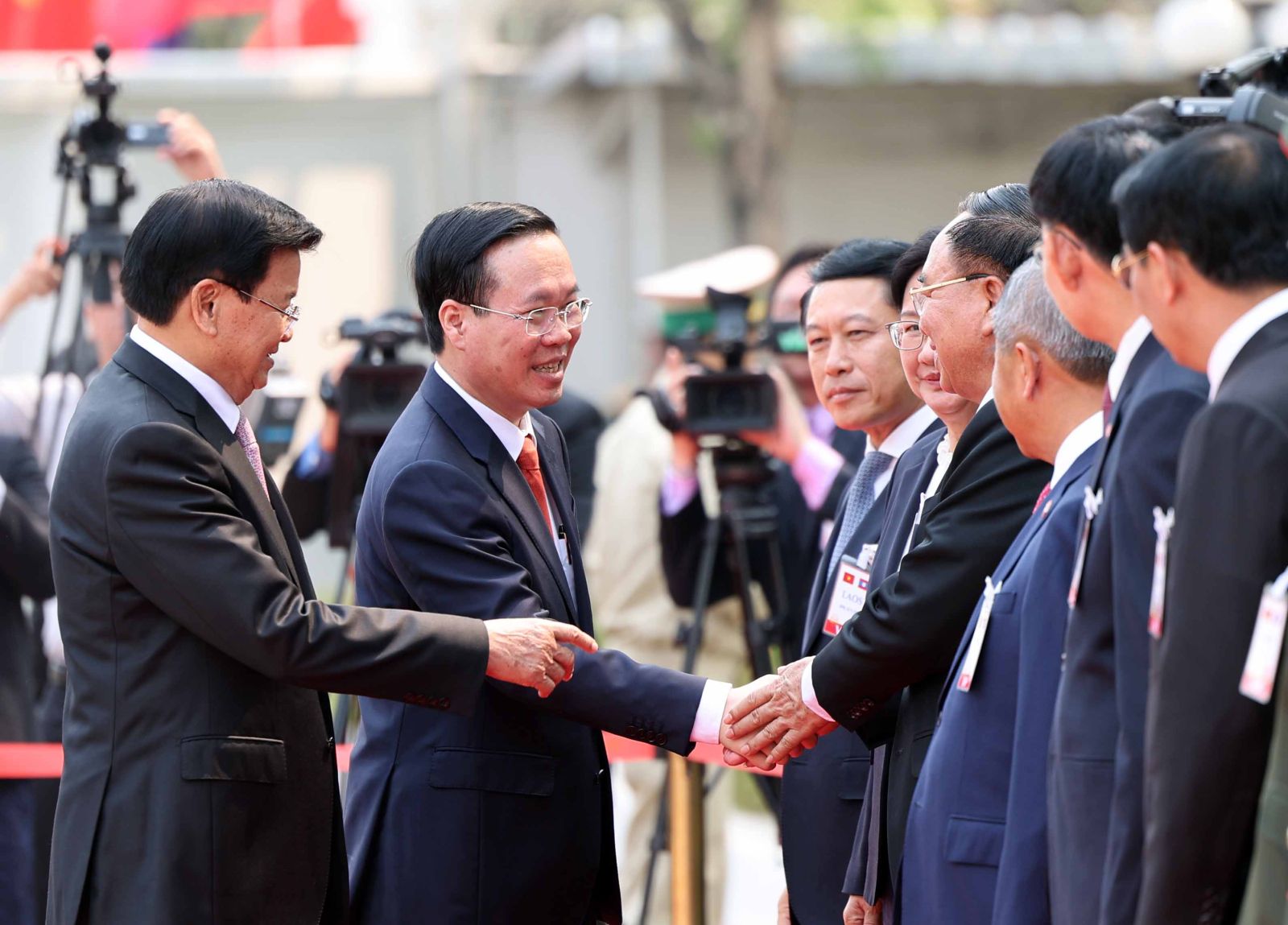 Chủ tịch nước Võ Văn Thưởng và Tổng Bí thư, Chủ tịch nước Lào Thongloun Sisoulith tại lễ đón. Ảnh: TTXVN