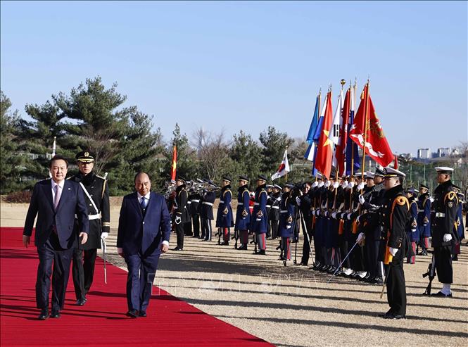 Tổng thống Hàn Quốc Yoon Suk-yeol đón Chủ tịch nước Nguyễn Xuân Phúc tại nơi đỗ xe; trân trọng mời Chủ tịch nước Nguyễn Xuân Phúc lên bục danh dự. Quân nhạc cử Quốc thiều hai nước. Cùng lúc, nhiều loạt đại bác vang lên chào mừng.