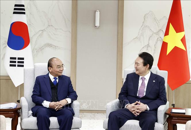 Chủ tịch nước Nguyễn Xuân Phúc và Tổng thống Yoon Suk-yeol. Ảnh: Thống Nhất/TTXVN