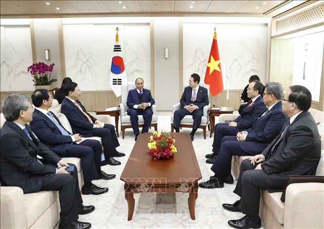 Chủ tịch nước Nguyễn Xuân Phúc gặp hẹp với Tổng thống Hàn Quốc Yoon Suk-yeol. Ảnh: Thống Nhất/TTXVN