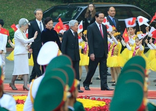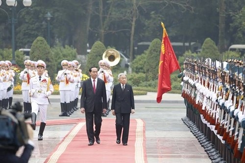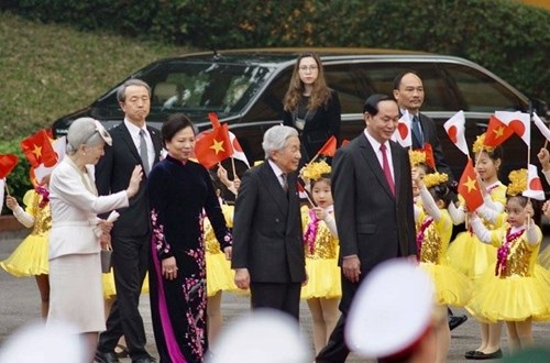 Lễ đón Nhà Vua Nhật Bản Akihito và Hoàng Hậu Michiko diễn ra tại Phủ chủ tịch, do Chủ tịch nước Trần Đại Quang chủ trì. Nhà Vua và Hoàng Hậu đang có chuyến thăm Việt Nam lần đầu tiên, từ ngày 28/2 tới ngày 5/3.