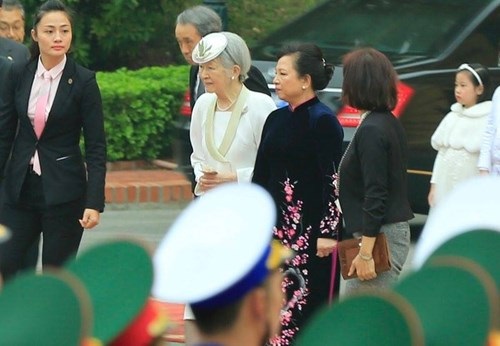 Phu nhân Chủ tịch nước Trần Đại Quang và Hoàng Hậu Nhật Bản tại lễ đón.