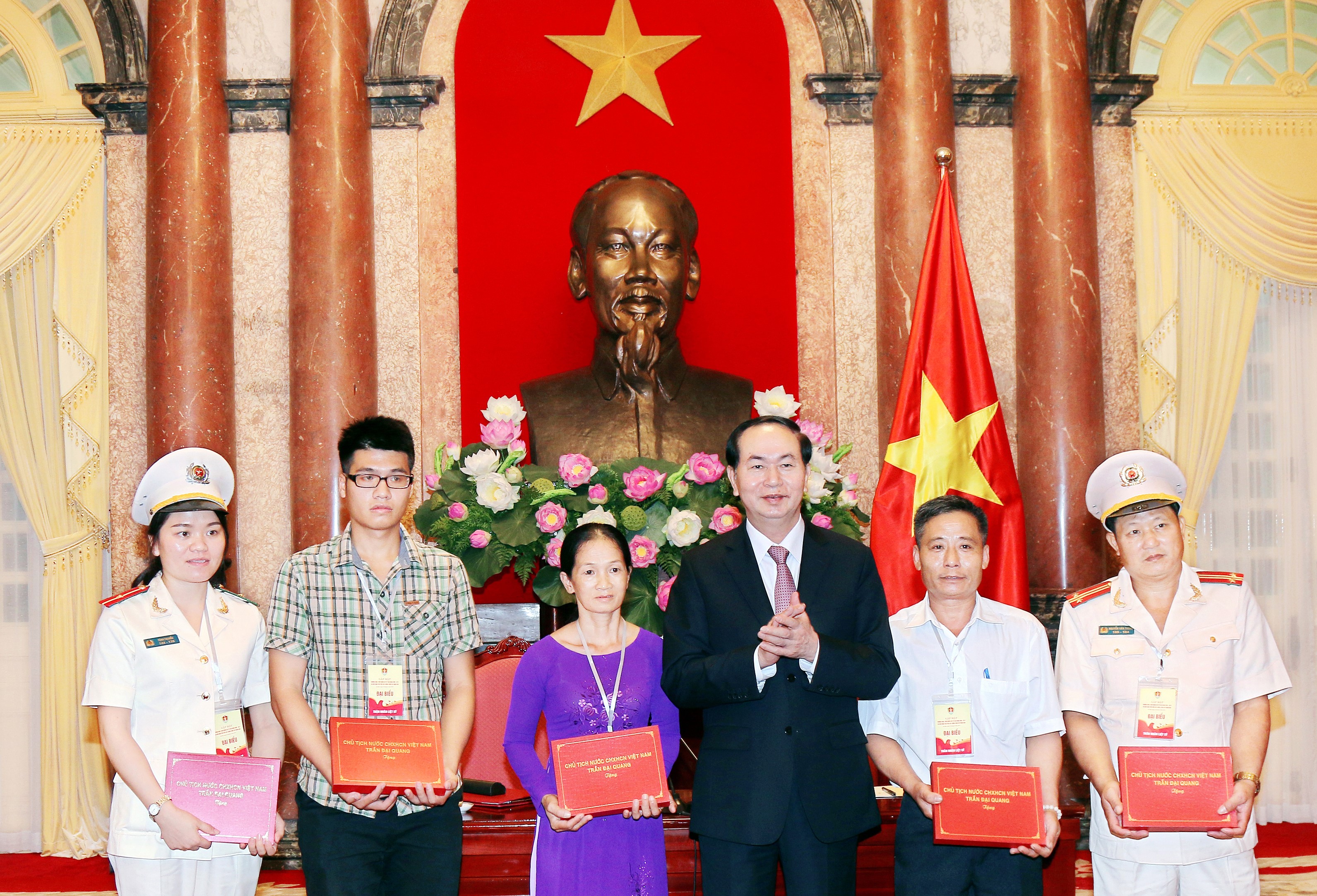Chủ tịch nước Trần Đại Quang trao quà tặng các đồng chí thương binh tiêu biểu trong lực lượng Công an nhân dân. Ảnh: VPCTN