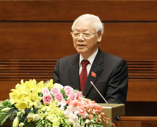 Tổng Bí thư Nguyễn Phú Trọng, Chủ tịch nước CHXHCN Việt Nam nhiệm kỳ 2016-2021 phát biểu nhậm chức Chủ tịch nước. (Ảnh: Phương Hoa/TTXVN)