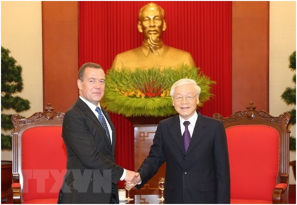 Thủ tướng Chính phủ Liên bang Nga, Chủ tịch Đảng Nước Nga Thống nhất bày tỏ vui mừng được thăm lại Việt Nam và được gặp lại Tổng Bí thư, Chủ tịch nước Nguyễn Phú Trọng.