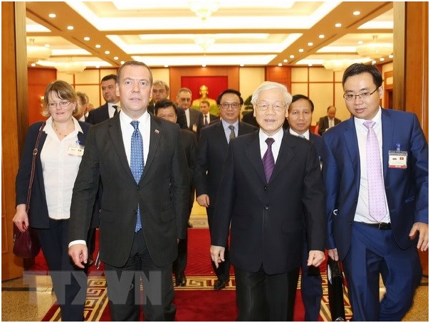 Chào mừng Thủ tướng Chính phủ Liên bang Nga, Tổng Bí thư, Chủ tịch nước Nguyễn Phú Trọng đánh giá cao ý nghĩa chuyến thăm chính thức Việt Nam lần này của ngài Dmitry Medvedev; nhấn mạnh quan hệ chính trị tin cậy giữa hai nước đang được củng cố vững chắc, thể hiện qua các chuyến thăm cấp cao và cao nhất của lãnh đạo hai nước thời gian gần đây.