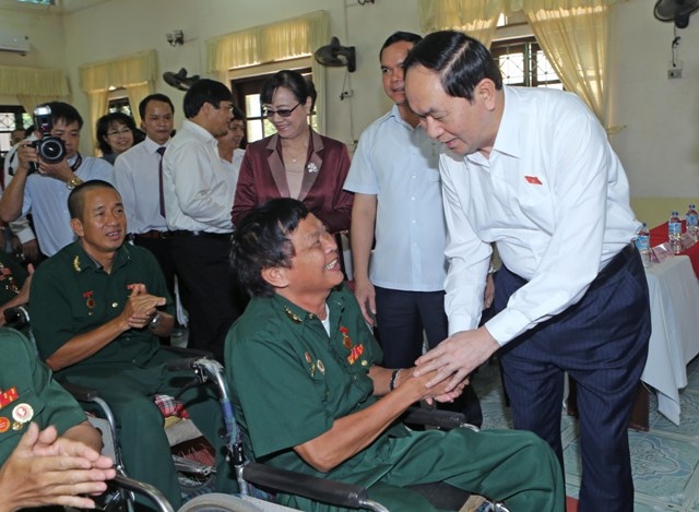Chủ tịch nước Trần Đại Quang thăm hỏi các thương, bệnh binh tại Trung tâm Điều dưỡng thương binh Duy Tiên, huyện Duy Tiên, tỉnh Hà Nam. Ảnh: NHAN SÁNG (TTXVN)