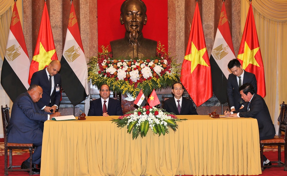 Chủ tịch nước Trần Đại Quang cho rằng, việc hai nước ký kết Biên bản Kỳ họp lần thứ năm Ủy ban Liên Chính phủ Việt Nam-Ai Cập và các văn kiện hợp tác về các lĩnh vực đầu tư, văn hóa, du lịch, giao thông, nghề cá, đất đai... nhân chuyến thăm Việt Nam của Tổng thống Abdel Fattah el-Sisi, sẽ góp phần hoàn thiện khuôn khổ pháp lý cho hợp tác song phương trong thời gian tới.