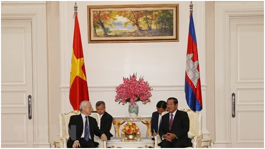 Tổng Bí thư, Chủ tịch nước Nguyễn Phú Trọng hội kiến với Thủ tướng Chính phủ Hoàng gia Campuchia Samdech Hun Sen. (Ảnh: Trí Dũng/TTXVN)