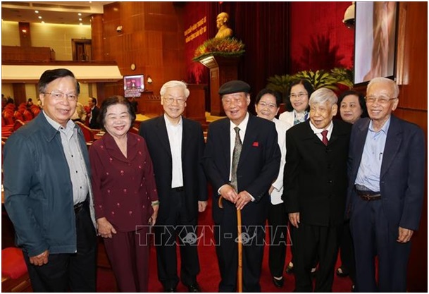 Dự Hội nghị có các đồng chí: Thủ tướng Chính phủ Nguyễn Xuân Phúc; Thường trực Ban Bí thư Trần Quốc Vượng; các đồng chí nguyên Tổng Bí thư: Lê Khả Phiêu, Nông Đức Mạnh; nguyên Chủ tịch nước: Trần Đức Lương, Trương Tấn Sang; nguyên Thủ tướng Chính phủ Nguyễn Tấn Dũng; nguyên Chủ tịch Quốc hội: Nguyễn Văn An, Nguyễn Sinh Hùng; các đồng chí Ủy viên Bộ Chính trị, Bí thư Trung ương Đảng, nguyên Ủy viên Bộ Chính trị, nguyên Bí thư Trung ương Đảng, nguyên Phó Chủ tịch nước, nguyên Phó Thủ tướng Chính phủ, nguyên Phó Chủ tịch Quốc hội, nguyên Chủ tịch Ủy ban Trung ương MTTQ Việt Nam, nguyên Ủy viên Trung ương Đảng, nguyên Bộ trưởng và tương đương, đại diện lãnh đạo Ban Tổ chức Trung ương, Ban Tuyên giáo Trung ương và Văn phòng Trung ương Đảng.