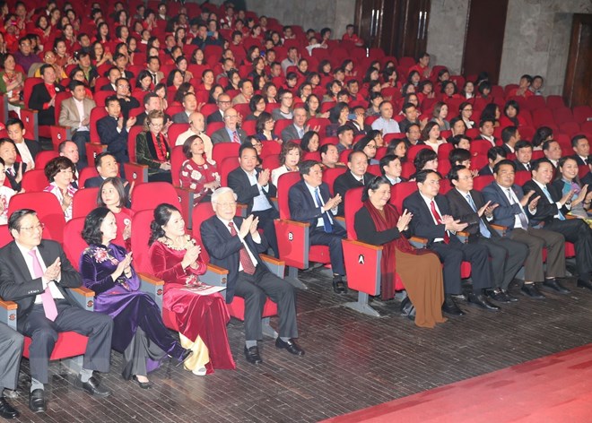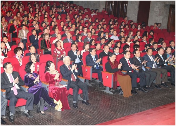 Tổng Bí thư, Chủ tịch nước Nguyễn Phú Trọng, Chủ tịch danh dự Hội Chữ thập Đỏ Việt Nam tham dự chương trình. (Ảnh: Trí Dũng/TTXVN)