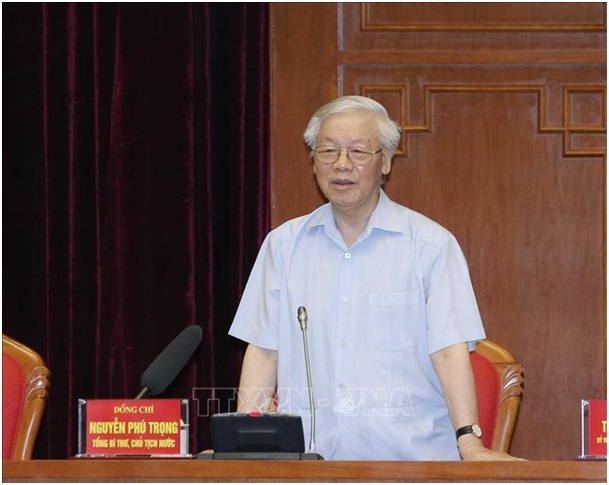 Toàn cảnh Tổng Bí thư, Chủ tịch nước Nguyễn Phú Trọng nói chuyện với các đảng viên trẻ tiêu biểu dự buổi gặp mặt. Ảnh: Trí Dũng/TTXVN