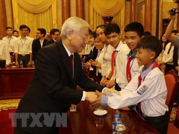 Tổng Bí thư, Chủ tịch nước Nguyễn Phú Trọng với các học sinh, sinh viên tiêu biểu, xuất sắc. (Ảnh: Trí Dũng/TTXVN)