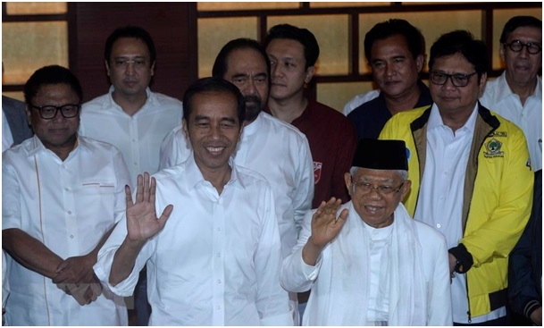 Tổng thống Indonesia Joko Widodo (trái) và người liên danh tranh cử chức phó tổng thống, giáo sỹ Maruf Amin (phải) tại cuộc họp báo sau kết quả kiểm phiếu nhanh ở Jakarta, Indonesia ngày 17/4. (Ảnh: THX/TTXVN)