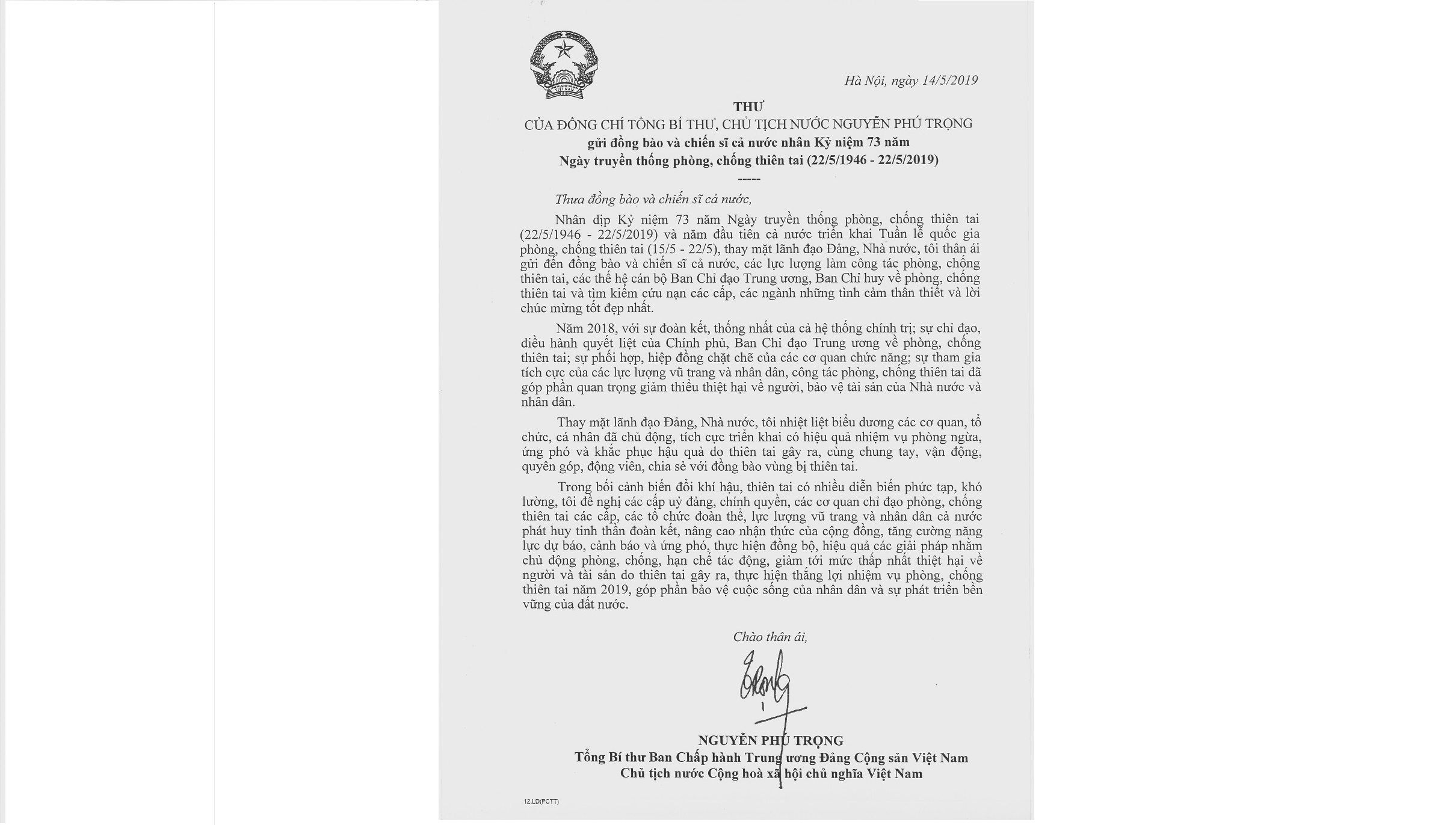 Tổng Bí thư, Chủ tịch nước kêu gọi: “Trong bối cảnh biến đổi khí hậu, thiên tai có nhiều diễn biến phức tạp, khó lường, tôi đề nghị các cấp ủy đảng, chính quyền, các cơ quan chỉ đạo phòng, chống thiên tai các cấp, các tổ chức đoàn thể, lực lượng vũ trang và nhân dân cả nước phát huy tinh thần đoàn kết, nâng cao nhận thức của cộng đồng, tăng cường năng lực dự báo, cảnh báo và ứng phó, thực hiện đồng bộ, hiệu quả các giải pháp nhằm chủ động phòng, chống, hạn chế tác động, giảm tới mức thấp nhất thiệt hại về người và tài sản do thiên tai gây ra, thực hiện thắng lợi nhiệm vụ phòng, chống thiên tai năm 2019, góp phần bảo vệ cuộc sống của nhân dân vào sự phát triển bền vững của đất nước.”