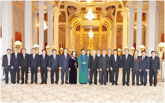 Tổng Bí thư, Chủ tịch nước Nguyễn Phú Trọng và Quốc vương Campuchia Norodom Sihamoni chụp ảnh chung với các đại biểu. (Ảnh: Trí Dũng/TTXVN)