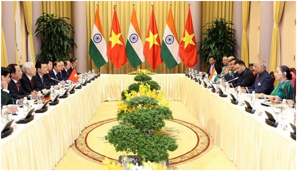 Tổng thống Ấn Độ nhấn mạnh Việt Nam là trụ cột trong chính sách “Hành động hướng Đông” của Ấn Độ, là đối tác then chốt của Ấn Độ trong ASEAN. Tổng Bí thư, Chủ tịch nước hoan nghênh lập trường của Ấn Độ về Biển Đông thời gian qua và đề nghị Ấn Độ tiếp tục ủng hộ chủ trương của Việt Nam và ASEAN về vấn đề này.