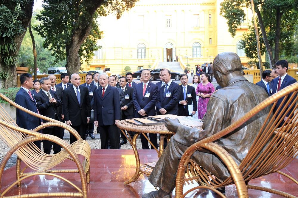 Tổng Bí thư, Chủ tịch nước Nguyễn Phú Trọng cùng Quốc vương Norodom Sihamoni thăm Khu di tích Phủ Chủ tịch. (Ảnh: Công Gôn/VPCTN)