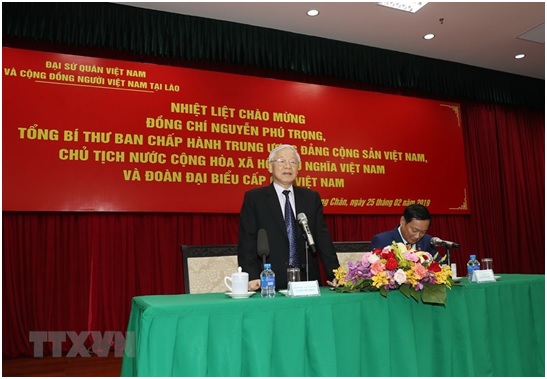 Trong khuôn khổ chuyến thăm hữu nghị chính thức Cộng hòa Dân chủ Nhân dân Lào, sáng 25/2, Tổng Bí thư, Chủ tịch nước Nguyễn Phú Trọng và đoàn đại biểu cấp cao Việt Nam đã thăm, nói chuyện thân mật với cán bộ, nhân viên Đại sứ quán, đại diện cộng đồng, lưu học sinh và doanh nghiệp Việt Nam tại Lào.