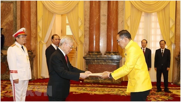 Đại sứ Đặc mệnh toàn quyền Vương quốc Thái Lan tại Việt Nam Tanee Sangrat trình Quốc thư lên Tổng Bí thư, Chủ tịch nước Nguyễn Phú Trọng. (Ảnh: Trí Dũng/TTXVN)