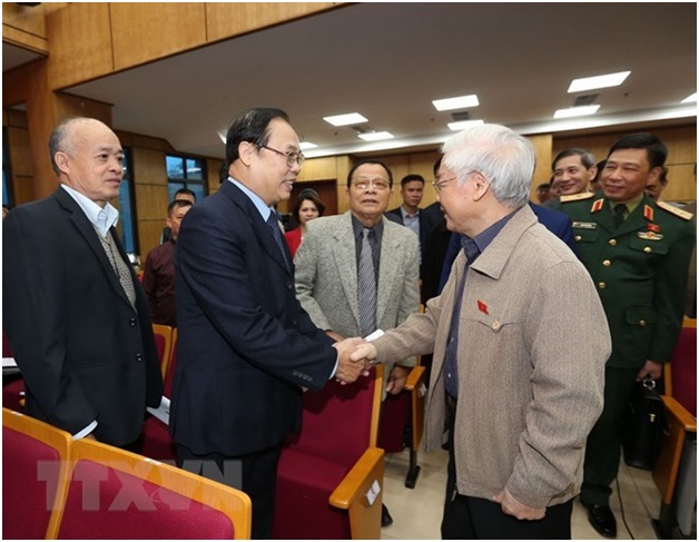 Tổng Bí thư, Chủ tịch nước Nguyễn Phú Trọng tiếp xúc cử tri quận Ba Đình và quận Tây Hồ. (Ảnh: Trí Dũng/TTXVN)
