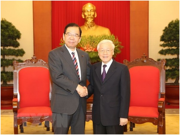 Tổng Bí thư, Chủ tịch nước Nguyễn Phú Trọng tiếp Chủ tịch Đảng Cộng sản Nhật Bản Kazuo Shii. (Ảnh: Trí Dũng/TTXVN)