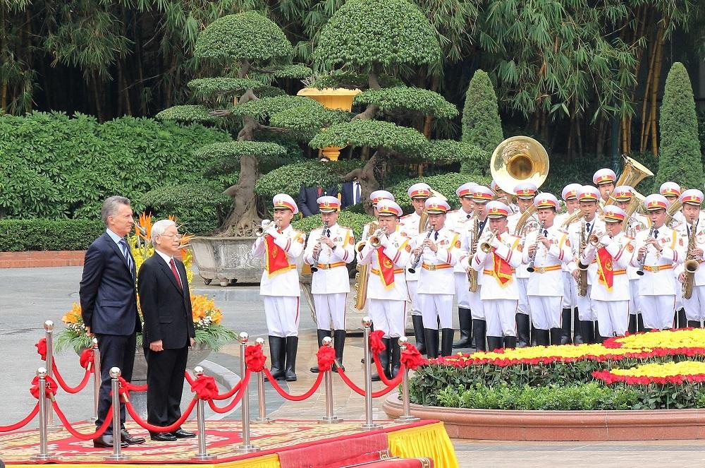 Tiếp đó, Tổng Bí thư, Chủ tịch nước Nguyễn Phú Trọng mời Tổng thống Argentina Mauricio Macri bước lên bục danh dự. Quân nhạc cử quốc thiều Argentina và Việt Nam. Tổng Bí thư, Chủ tịch nước Nguyễn Phú Trọng cùng Tổng thống Argentina Mauricio Macri duyệt đội danh dự và giới thiệu các quan chức hai bên có mặt tại Lễ đón.