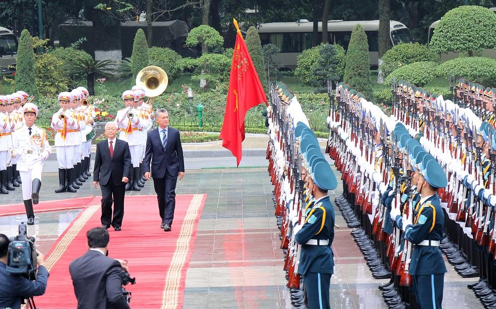Nhận lời mời của Chủ tịch nước Cộng hòa xã hội chủ nghĩa Việt Nam Nguyễn Phú Trọng, Tổng thống nước Cộng hòa Argentina Mauricio Macri và Phu nhân thực hiện chuyến thăm cấp Nhà nước tới Việt Nam từ ngày 19-21/2. Sáng 20/2, Lễ đón chính thức Tổng thống Cộng hòa Argentina Mauricio Macri và Phu nhân được tổ chức trọng thể tại Phủ Chủ tịch theo nghi thức cao nhất dành cho nguyên thủ quốc gia.