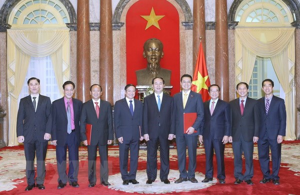 Chủ tịch nước Trần Đại Quang, Chủ nhiệm Văn phòng Chủ tịch nước Đào Việt Trung (thứ ba từ phải sang) với các đại sứ mới được bổ nhiệm. (Ảnh: Nhan Sáng/TTXVN)