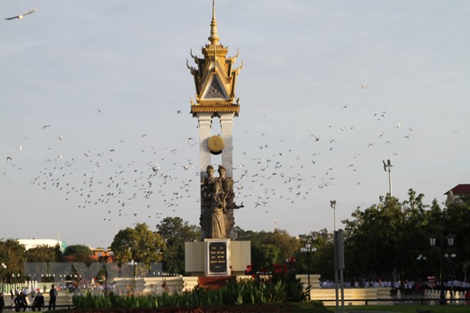 Chim bồ câu hòa bình tung cách bay trước Đài Hữu nghị Việt Nam-Campuchia ở thủ đô Phnom Penh ngày diễn ra lễ kỷ niệm 65 năm Quốc khánh Campuchia. (Ảnh: TTXVN)