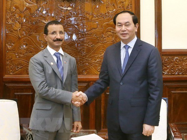 Chủ tịch nước Trần Đại Quang tiếp ông Sultan Ahmed bin Sulayem, Chủ tịch Tập đoàn DP World của Các Tiểu vương quốc Arab Thống nhất (UAE) đang thăm và làm việc tại Việt Nam. (Ảnh: Nhan Sáng/TTXVN)