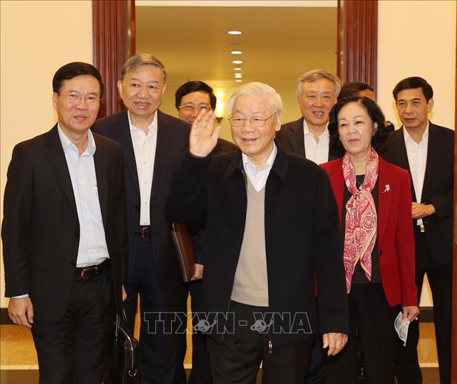 Tổng Bí thư, Chủ tịch nước Nguyễn Phú Trọng và các đồng chí trong Bộ Chính trị, Ban Bí thư đến dự phiên họp. Ảnh: Trí Dũng/TTXVN