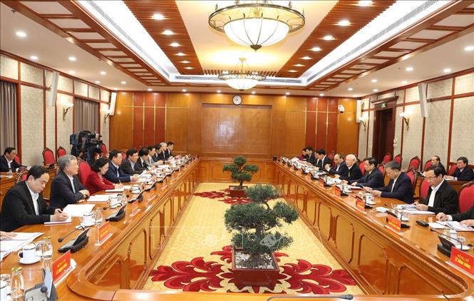 Tổng Bí thư, Chủ tịch nước Nguyễn Phú Trọng và các đồng chí trong Bộ Chính trị, Ban Bí thư tại phiên họp. Ảnh: Trí Dũng/TTXVN