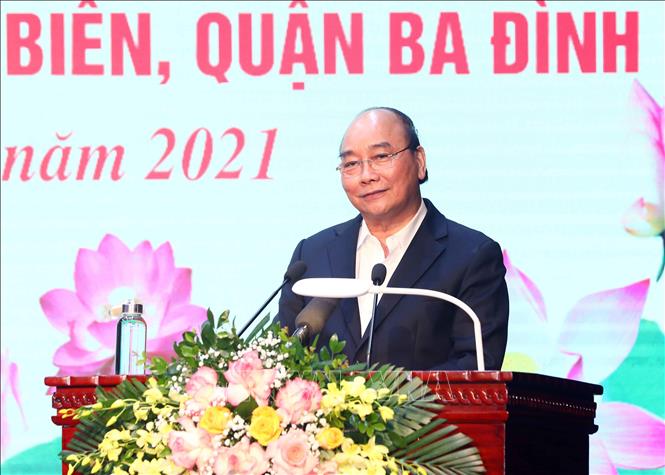 Chủ tịch nước Nguyễn Xuân Phúc với nhân dân phường Điện Biên, quận Ba Đình, Hà Nội. Ảnh: Phạm Kiên/TTXVN